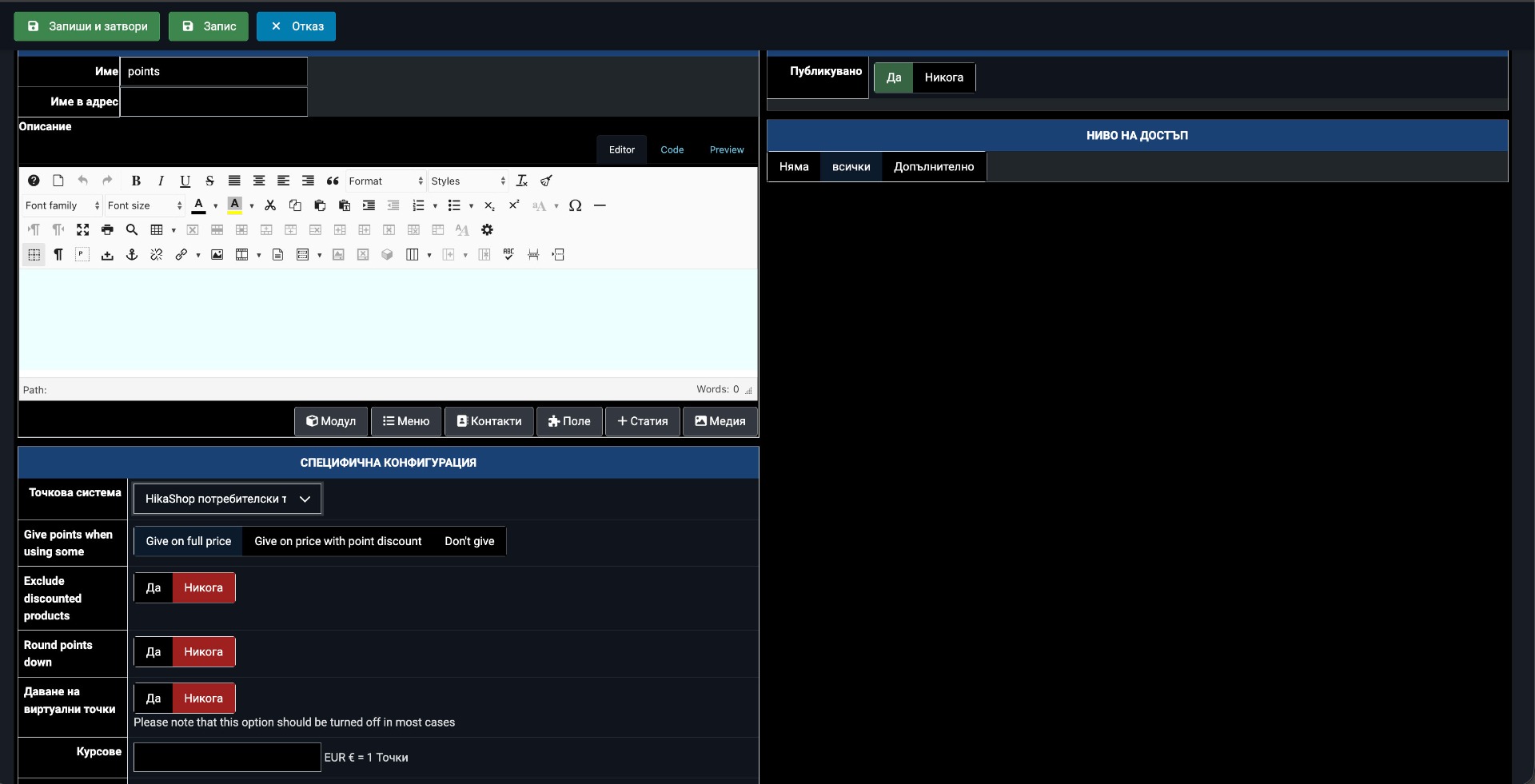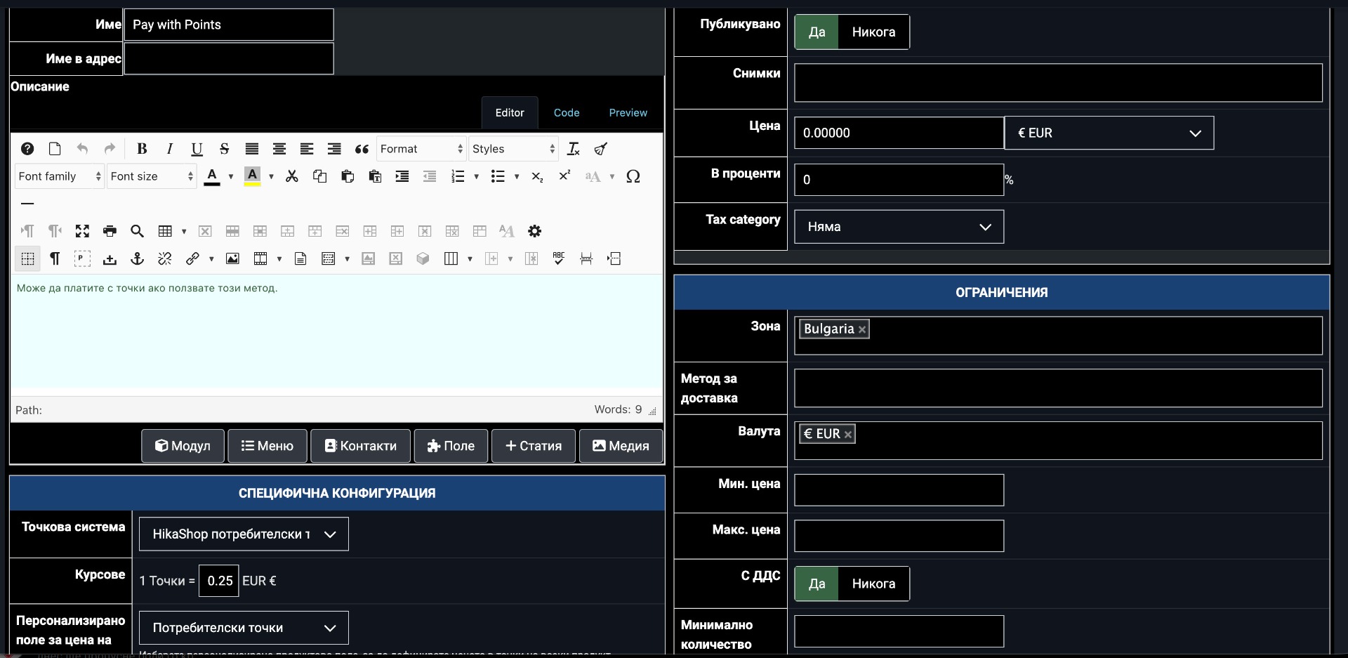 Also, you have the product custom field "userpoints" set to 7 for a product priced at 39 EUR. If you're using the custom field to define a fixed point cost for products, this means the product costs 7 points (= 1.75 EUR at your current 0.25 rate). If you want 7 points to cover the full 39 EUR, you would need to set the rate to approximately 1 point = 5.57 EUR. Alternatively, if you want each product to define its own point price independently from the EUR exchange rate, you can use the "Custom field for price in points" setting, which overrides the exchange rate calculation for that product.