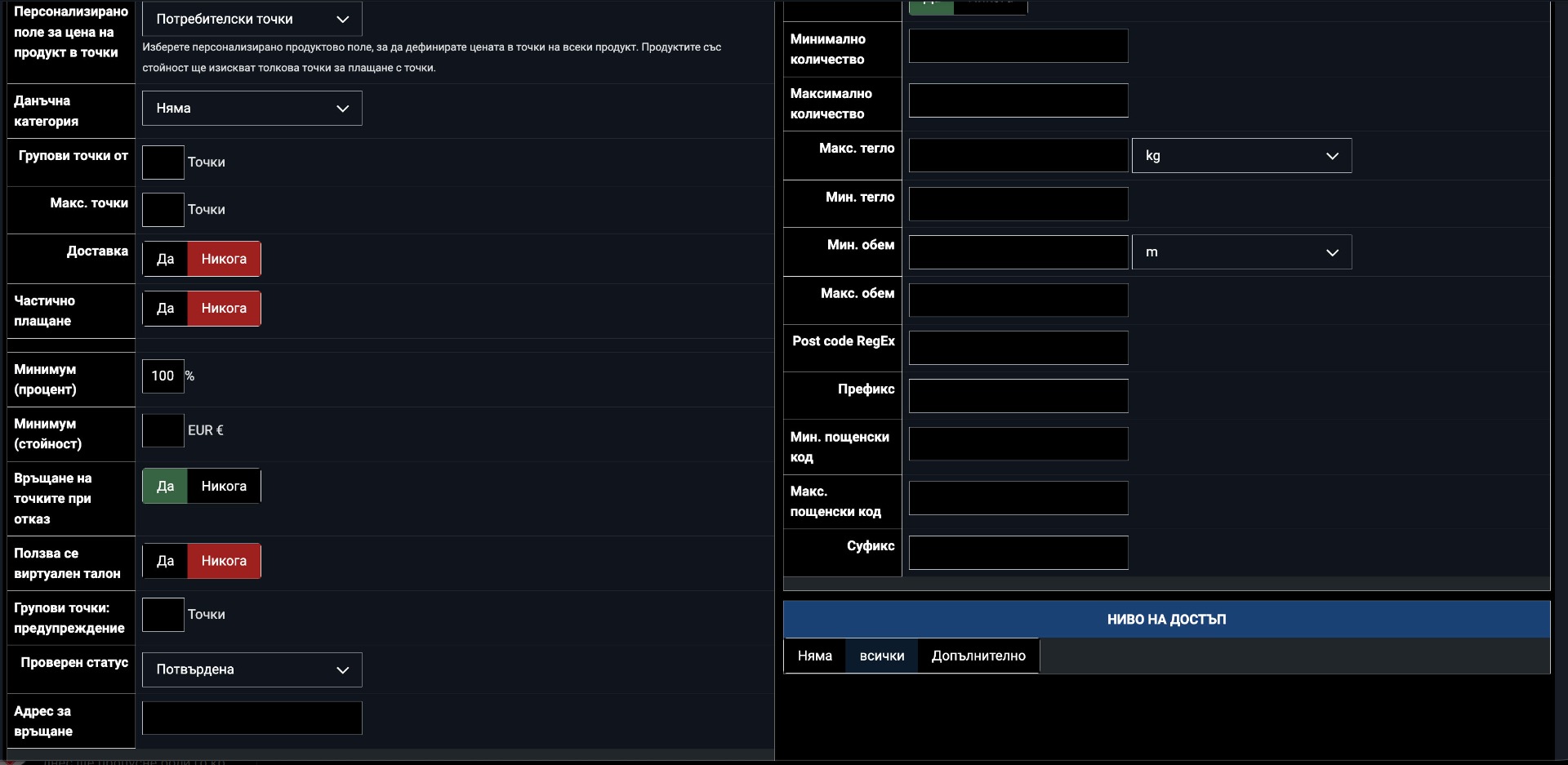 In your "Pay with Points" payment method configuration, you have "Partial payment" set to "No" and "Minimum (percent)" set to 100%. This means the customer must pay the full amount in points or not at all. To allow partial payment (points + money), set "Partial payment" to "Yes" and lower the minimum percentage. For example, setting the minimum to 0% would allow the customer to use whatever points they have and pay the rest with another payment method.