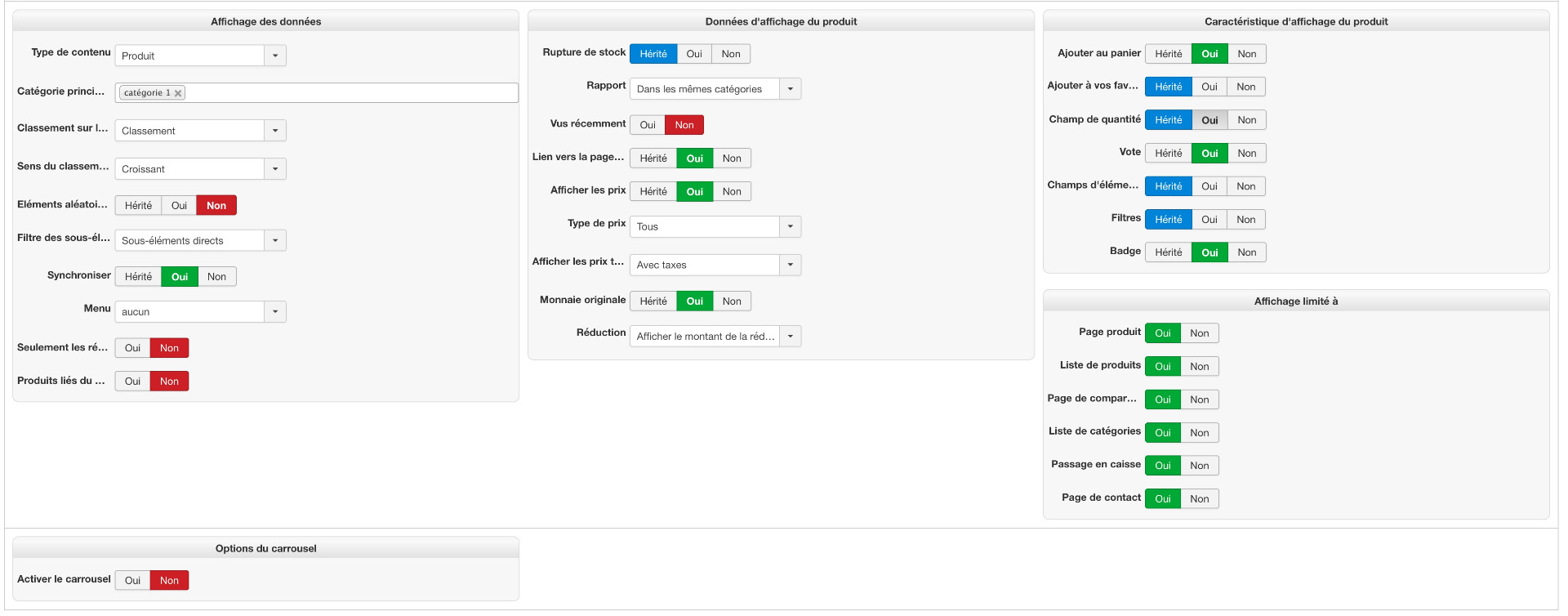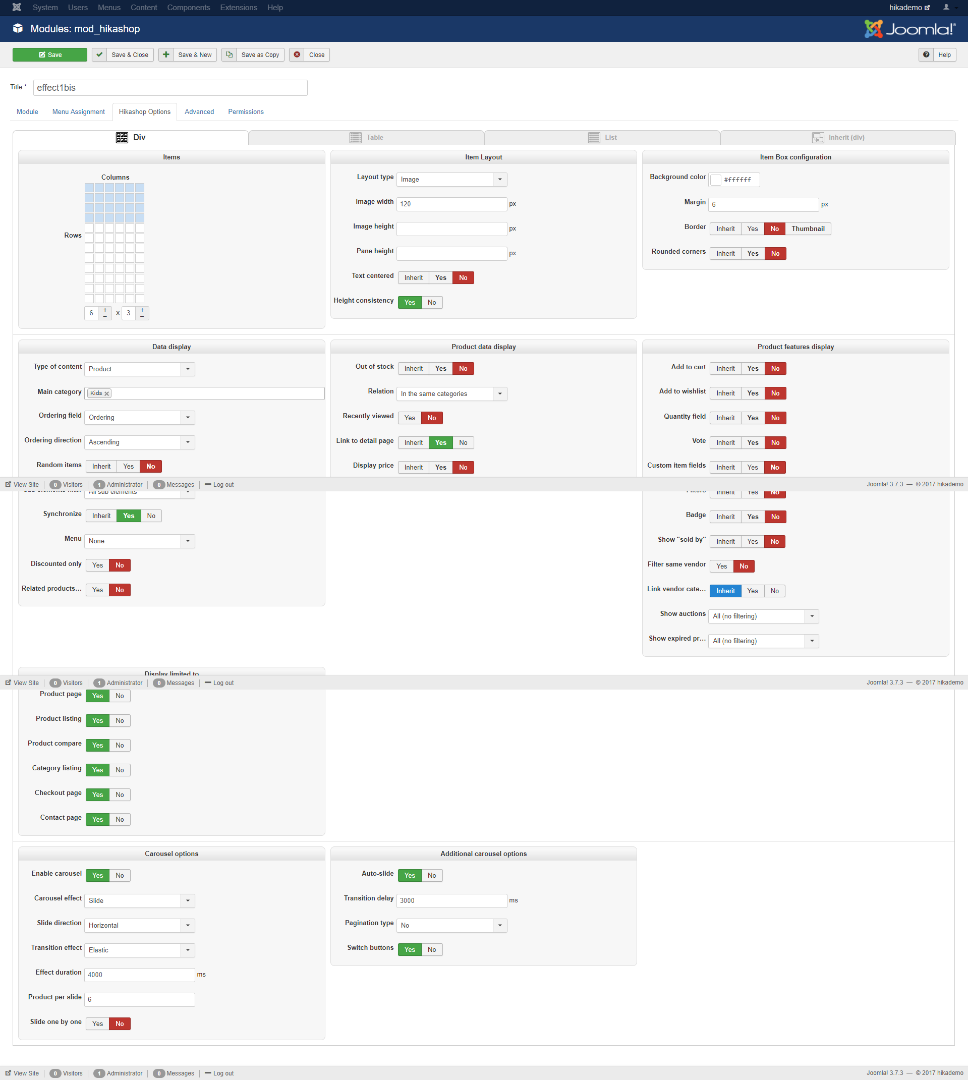 Dans extension > modules >Hikashop content modules je peux créer un module avec un carrousel mais cela n'a rien a voir avec la configuration spécial montré sur le site de démo.