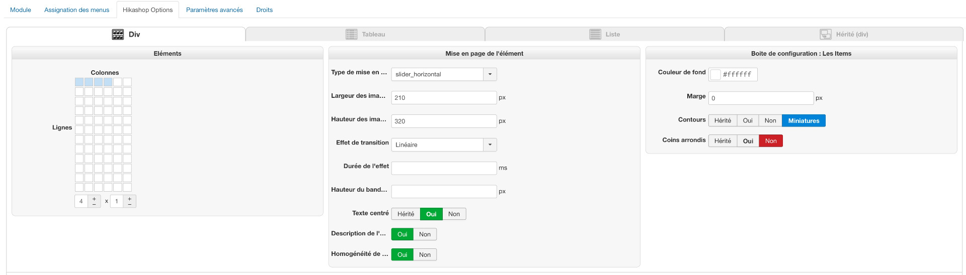 De plus je ne comprend pas pourquoi le prix du produit ne s'affiche pas dans Hikashop Options (DIV) Mise en page de l'élément > Slider_horizontale .