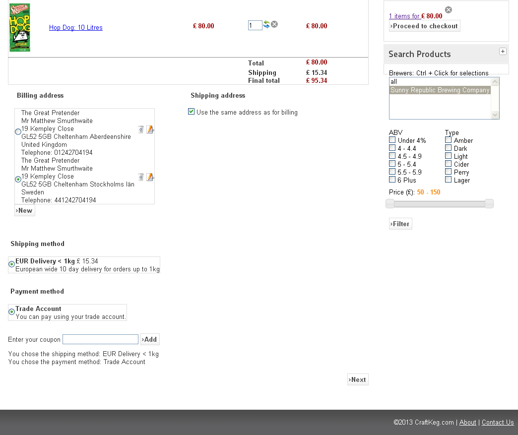 You will notice that there are two possible billing addresses, and two possible shipping addresses. They are very close together, one above the other. What I would like to do is introduce a space between them, and I suspect the best way to do this is to add padding after the telephone number, which is what I was trying to do.