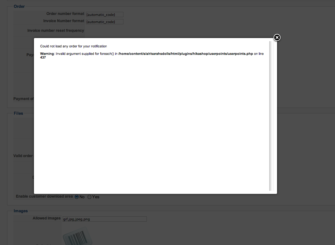 Warning: Invalid argument supplied for foreach() in /home/content/s/a/r/sarahsdolls/html/plugins/hikashop/userpoints/userpoints.php on line 437