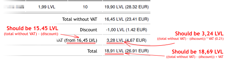 attachinvoice/invoice.php to correct invoices, but than price totals in Hikashop backend won't mach the ones in invoices sent to clients, so I'd like to undertstand what's wrong with current calculation logic...