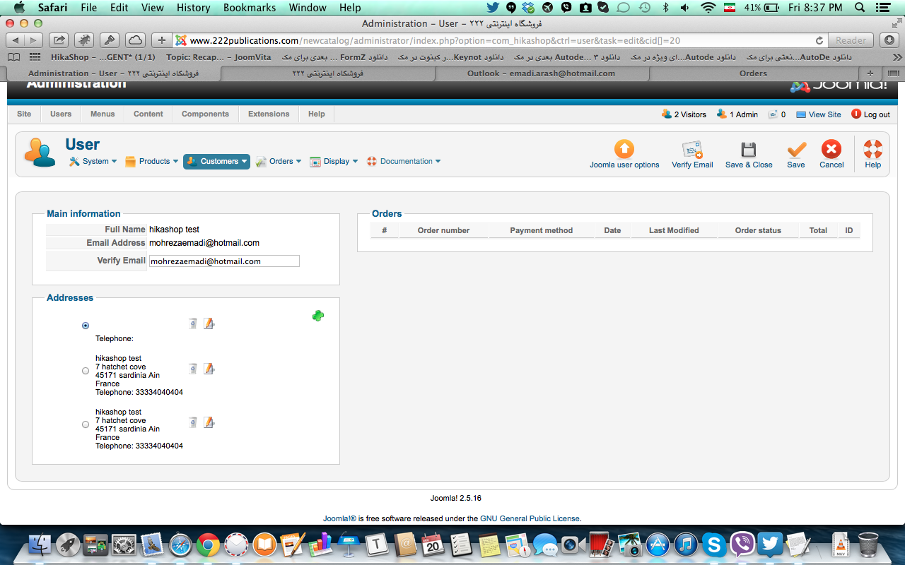 The Second screenshot is a test account I made for HikaShop moderators to test something. You can see even in the backend there's an empty address with a blank telephone added. The other two addresses were added manually by the moderators themselves.