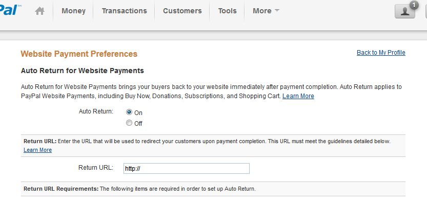 (the Itemid parameter will vary based on how your website is configured). However, in that case, it is a manual process and the user has to click on the "return to the website" link after the payment to go back there. So the auto return option of PayPal allows you to automate that, but that requires that you give your return URL yourself to PayPal. Just make sure that you give the return URL and not the IPN URL.