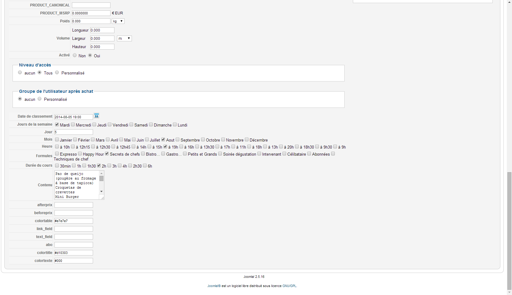 Bonjour, enfaite j'ai rajouté des champ personnalisé à mes produits (cours de cuisiner) tel que :