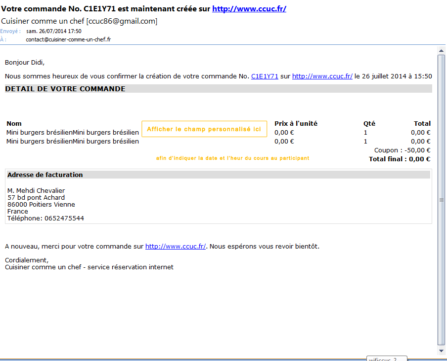 afficher un champs personnalisé panier mail email