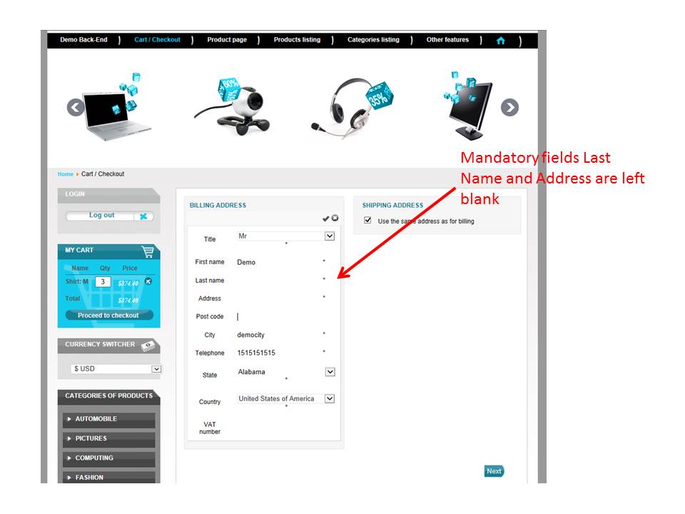 Hikashop allows the checkout process to move on to the following checkout step (and eventually complete the checkout process) without mandatory fields being filled in.
