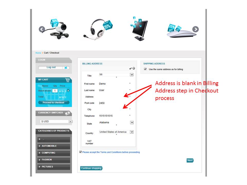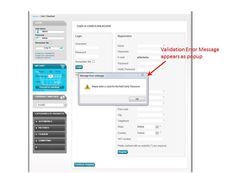 The field validation behaviour and error message display are inconsistent during the checkout process. Sometimes the error is displayed as a popup and the user cannot proceed until the error is corrected (i.e. one error at a time) whilst at other times, the errors are lumped together (and the user is allowed to continue to the next field and/or step) and then, all the errors are displayed together at the Joomla! message area.