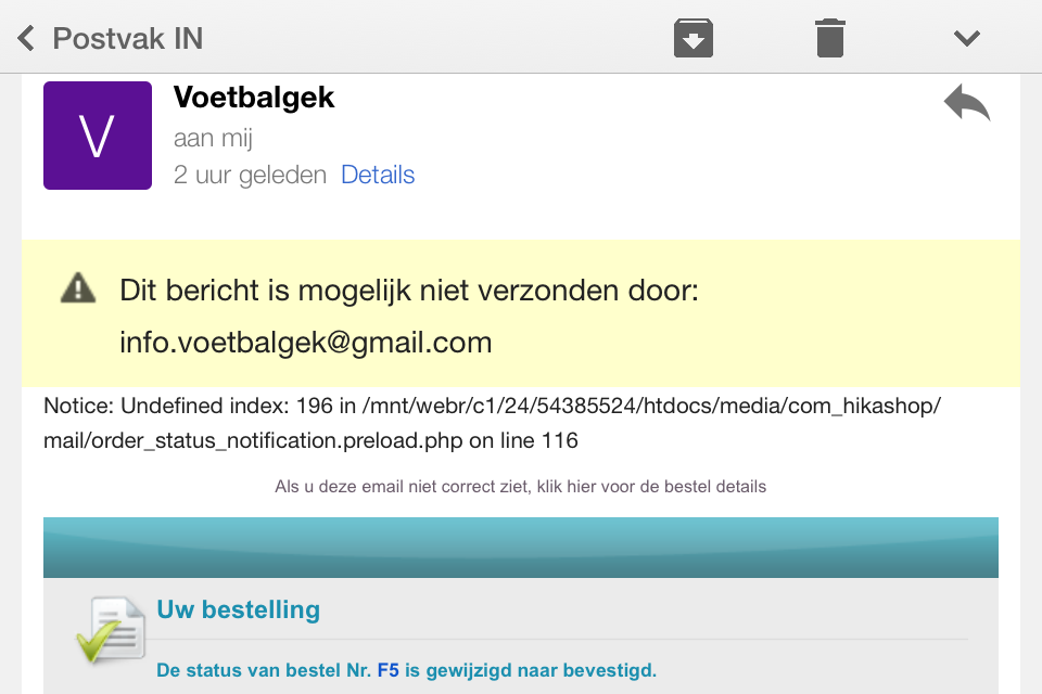 It looks like in the HikaShop configuration you've set that Gmail address as "From" address. However, the system is not using a Gmail outgoing mail server, but your domain's mail server named "whatever.voetbalgek.info".