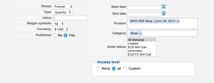 A little additional info, I tried adding the product category (although that wasn't necessary before) as well as putting in a start date. Still no change.