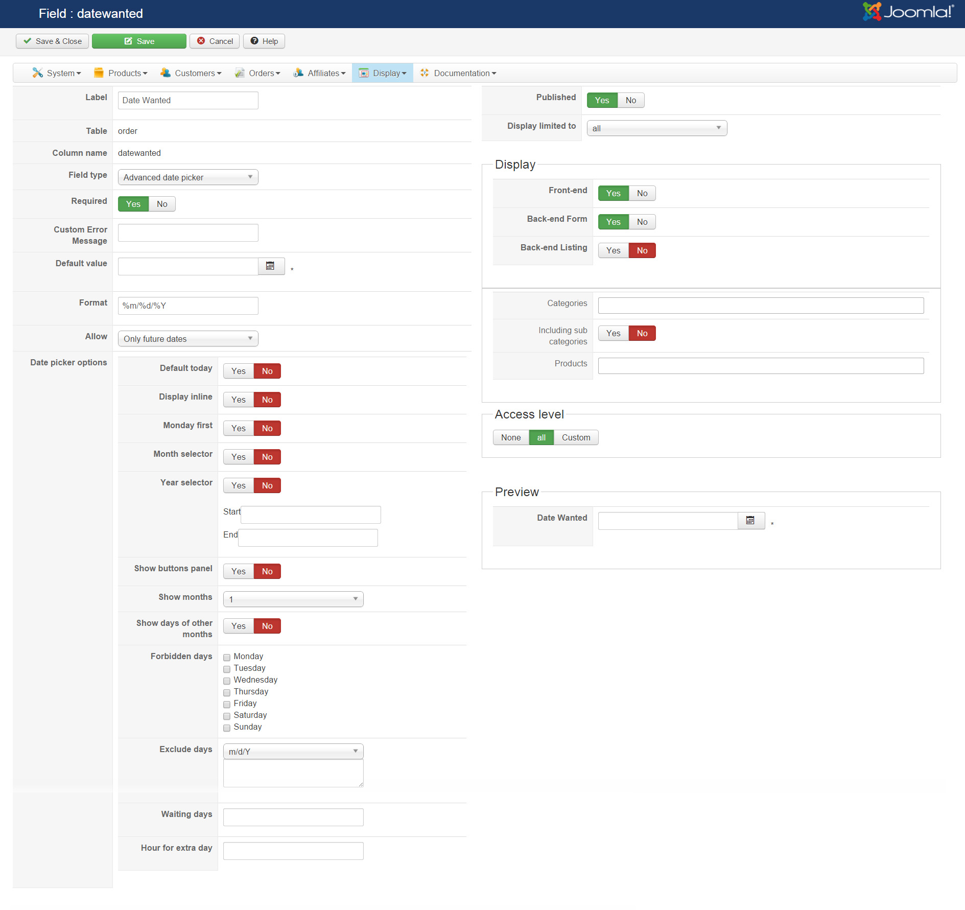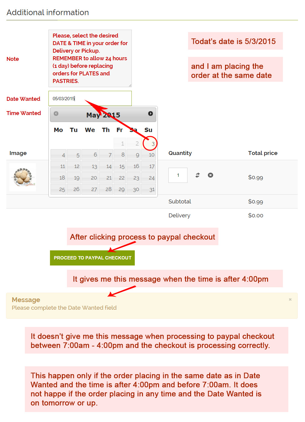 However, about the date. I checked it and it seems I can select today's date if the time is between 7:00am - 4:00pm. It is fine for me for now. But, If I want to play with this time and make the today's date between 8:00am - 8:00pm, how can I do that? After 4:00pm, today's date is still active, but when click on "process to checkout" it gives me "Please complete the Wanted Date field" I attached a screen shoot for the date setting and the message.