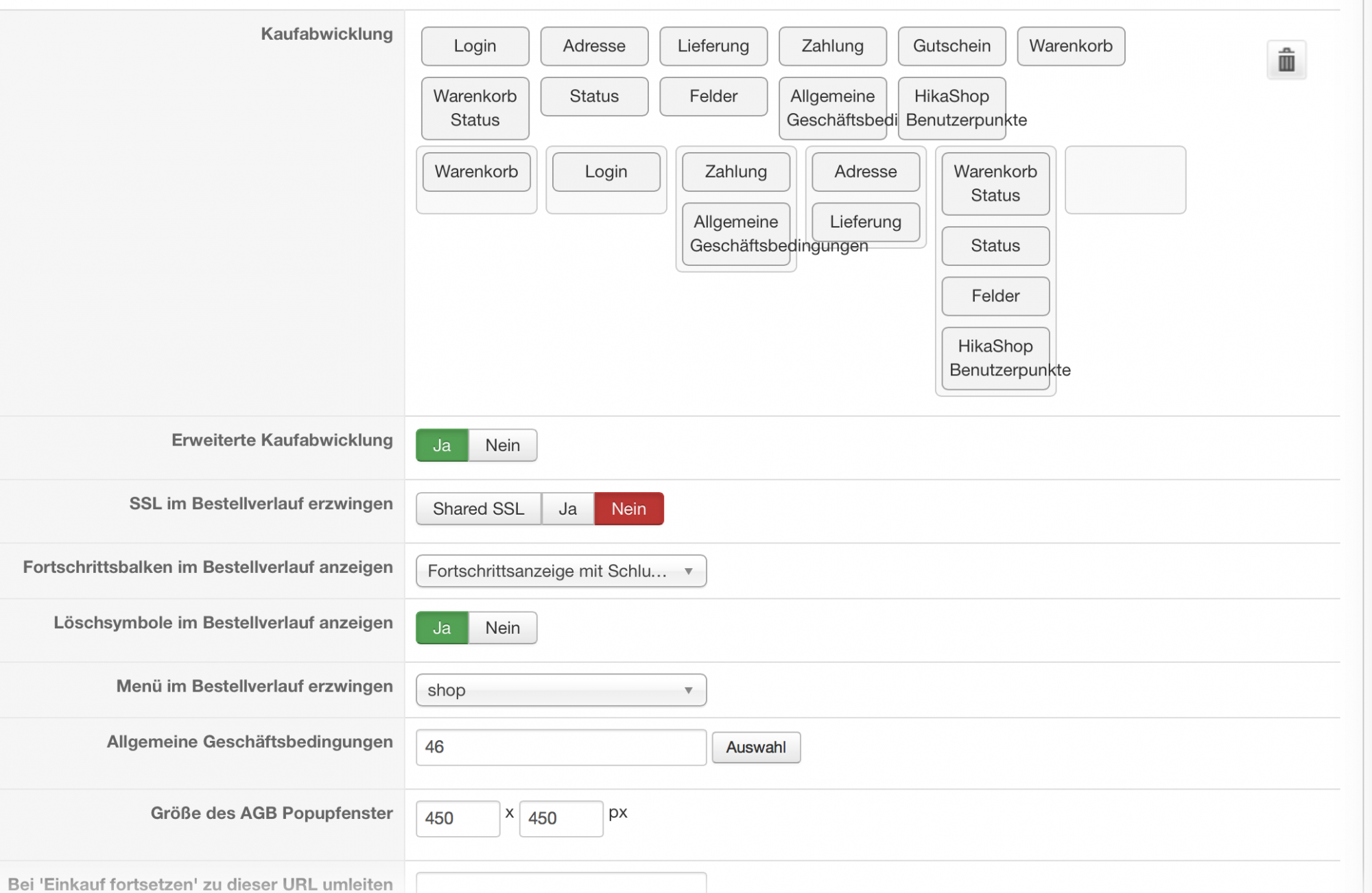 Could you provide a screenshot of all the settings of the "Checkout" tab of the HikaShop configuration so that we can see how you setup your checkout ?