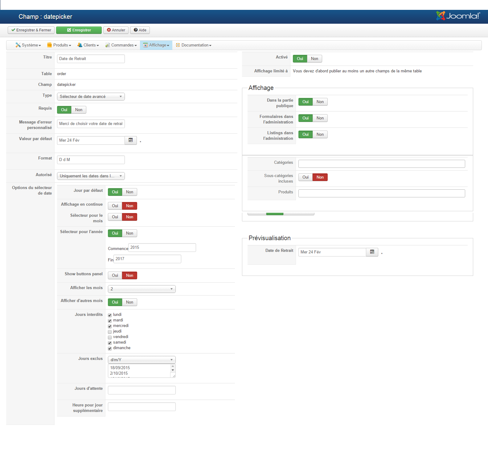 1. Pouvez vous me montrer la manière dont vous avez configuré votre champs personnalisé "Date de Retrait" via quelques captures d'écran ?