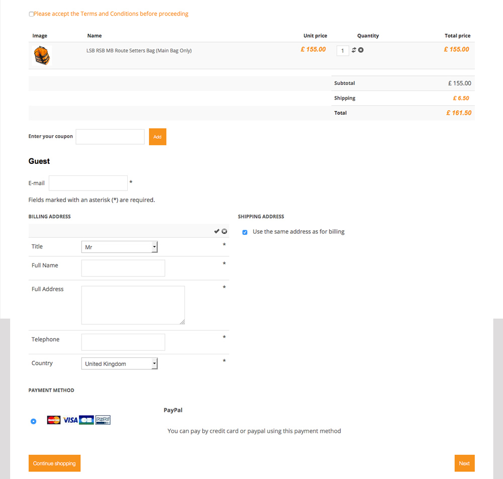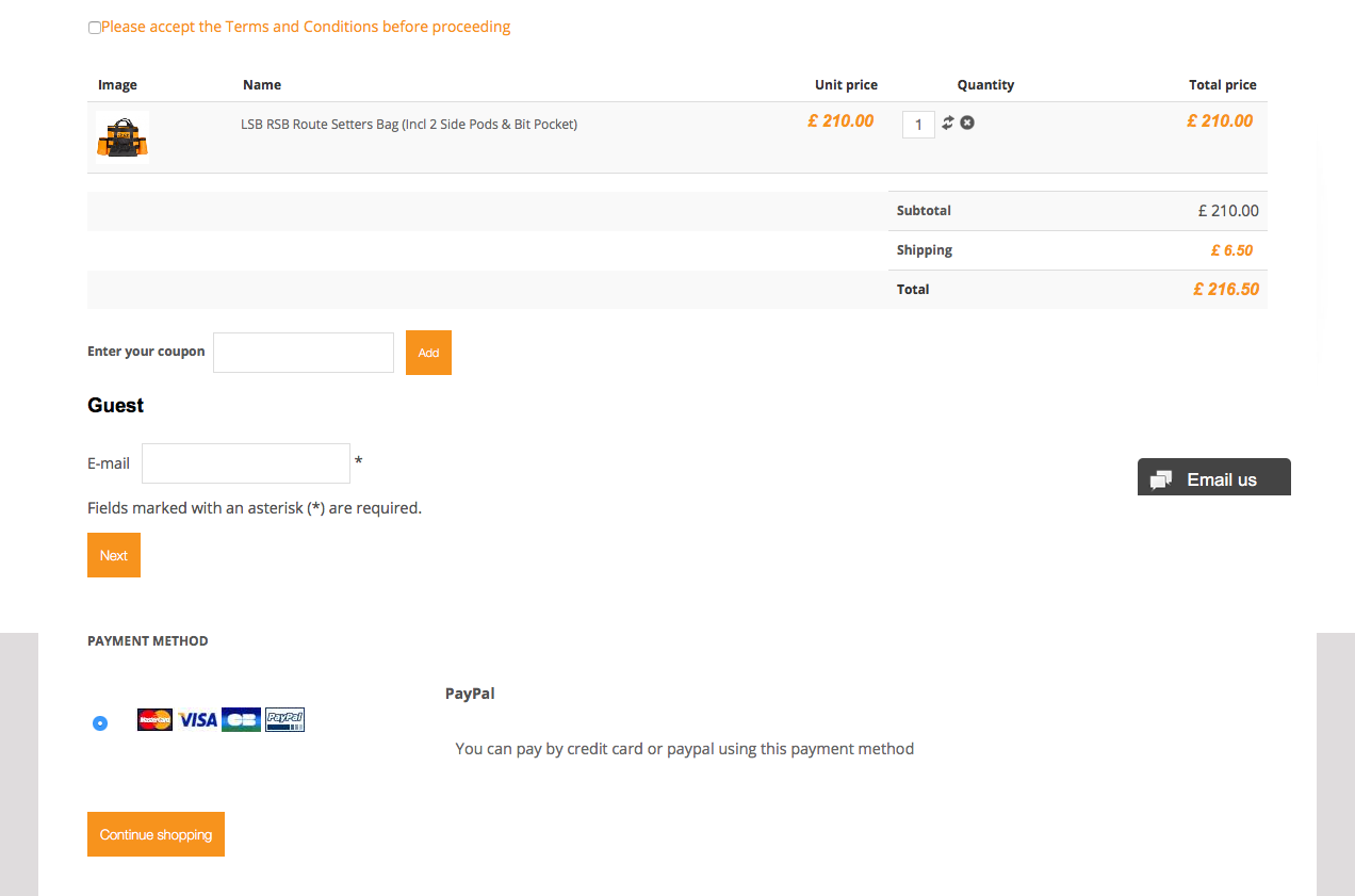 I've mocked this up using a combination of the 2 pages so you can see exactly what I'm after. Basically just a single checkout page as per the screenshot with terms, cart, coupon, email address, postal address, payment. I can see no way to do this in Hikashop?