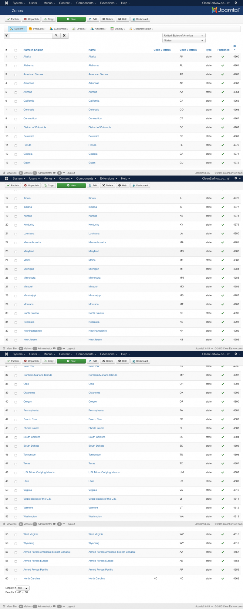I would like to set up the zones or whatever I need to set up so that only the United States and Canada are in the drop downs in login during checkout. At this moment, I have unpublished all countries except the USA and CAN. But, only one of the states/provinces show during checkout. See the attachement.