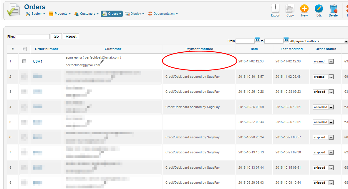 In the back-end order screen, the Payment method field will be blank [3], and when the user is logged in via the front-end, there is a Pay Now button that doesn't go anywhere [4,5].
