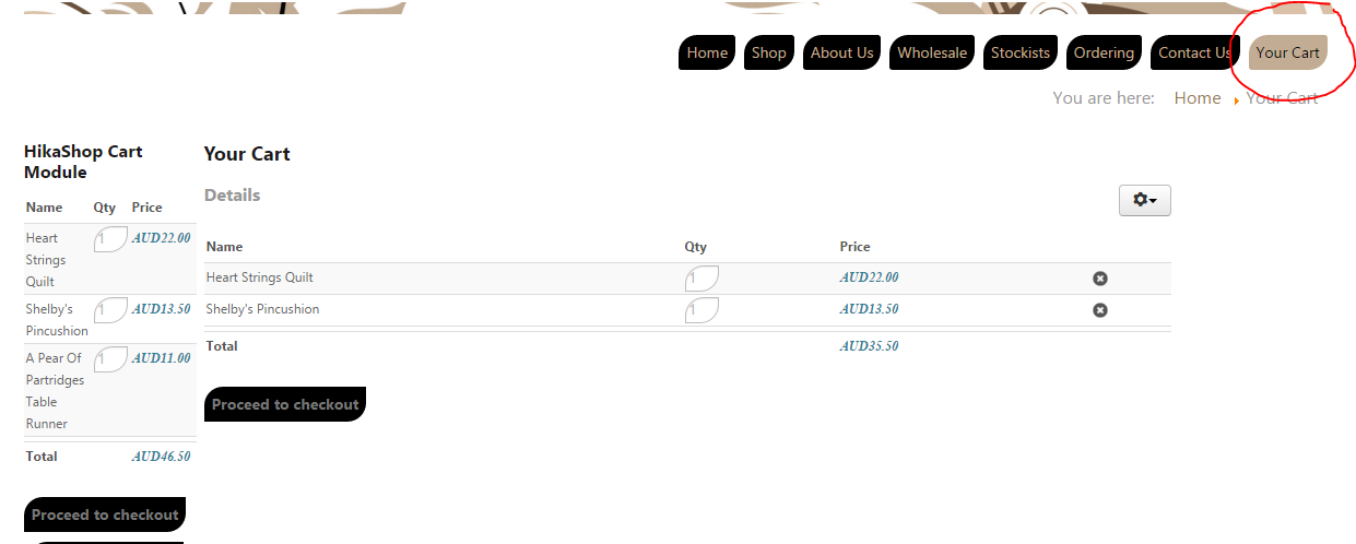 My aim was to have the cart contents in the middle of the page so that eventually I could remove the version above the left menu. I would have the cart appearing in 2 locations. I was expecting that I would not have the carts appearing exactly the same due to size constraints but the left menu version being different to the centre version was unexpected. Incidentally the left hand version is the correct version.