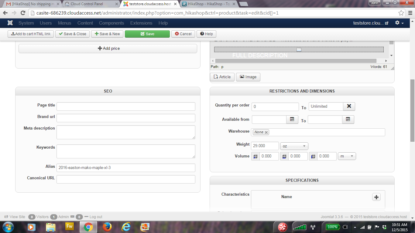 2. No warehouse is set in each product still though. In the RESTRICTIONS AND DIMENSIONS it says None and no Warehouse shows to pick in product settings. (see number 3 below).
