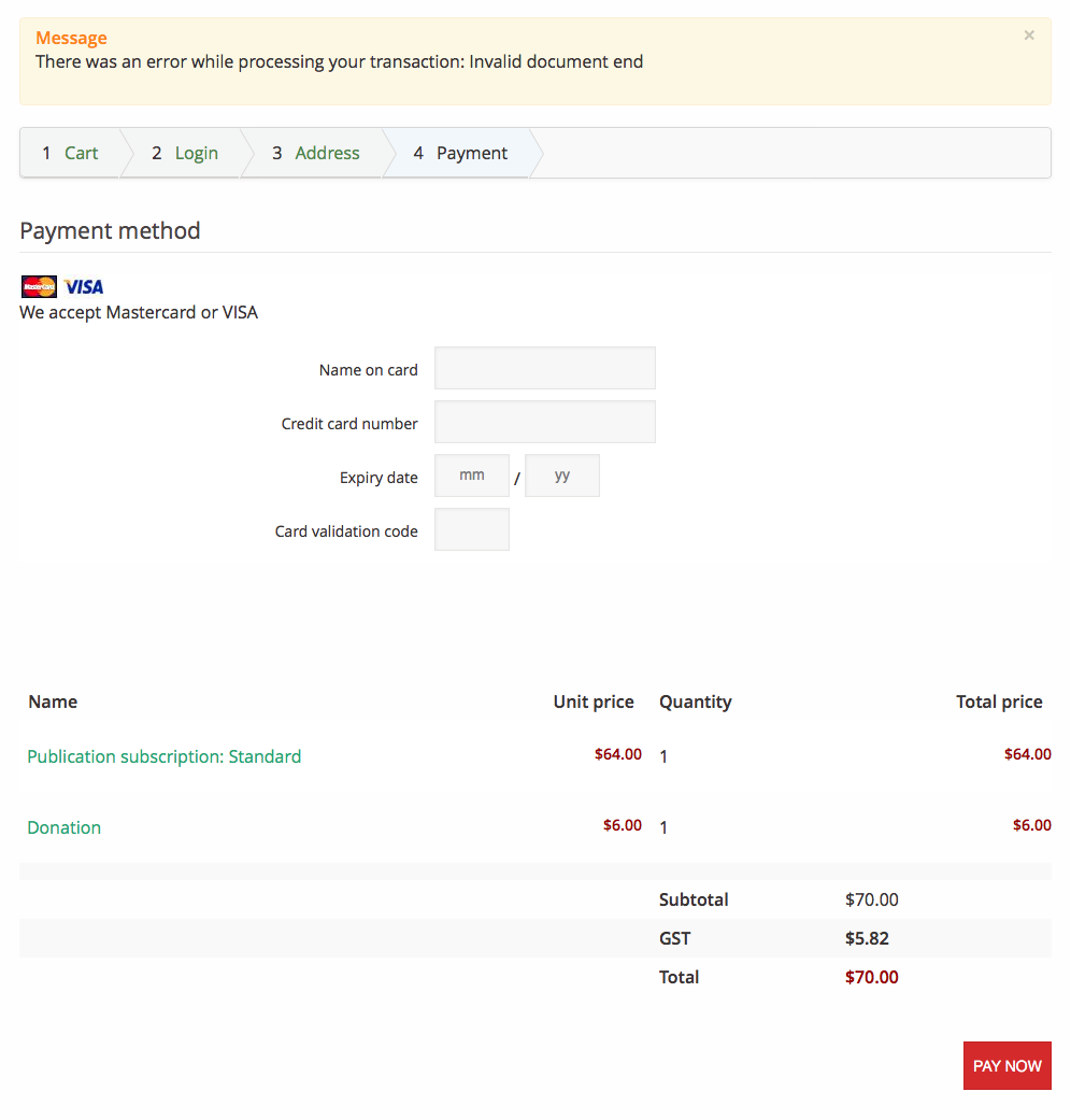 The error message "Invalid document end" actually comes from Eway themselves because their server couldn't read the payment request sent to it by the eway payment plugin, which actually uses the EwayPaymentLib class helper provided by eway to format the request to their server.