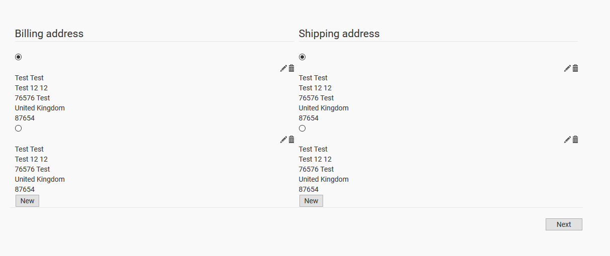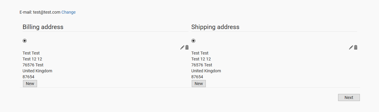 Well the address system is really confusing sometimes... We just want to have 1 shipping and 1 billing address. Then remove "NEW" button and allow user to edit or delete. On edit or delete shipping address, billing address shouldn't ber changed and vice versa. Now they are connected as one and thats the issue...