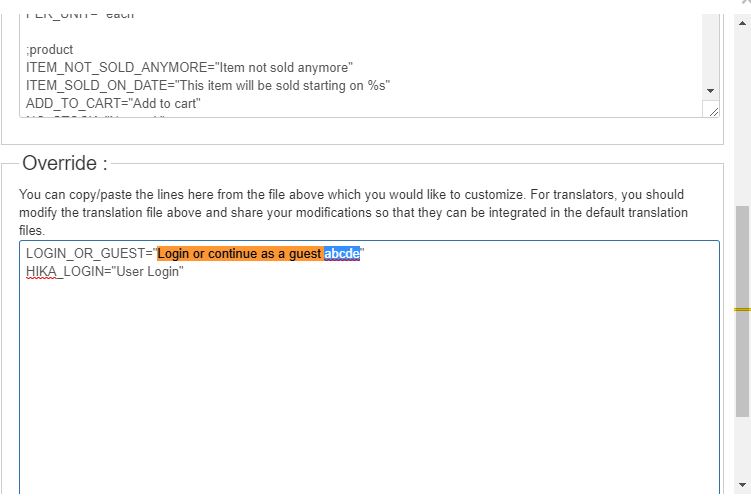 I tried to edit the text "Login or continue as a guest" in checkout to my custom text, but it didn't work. Below please find my steps: