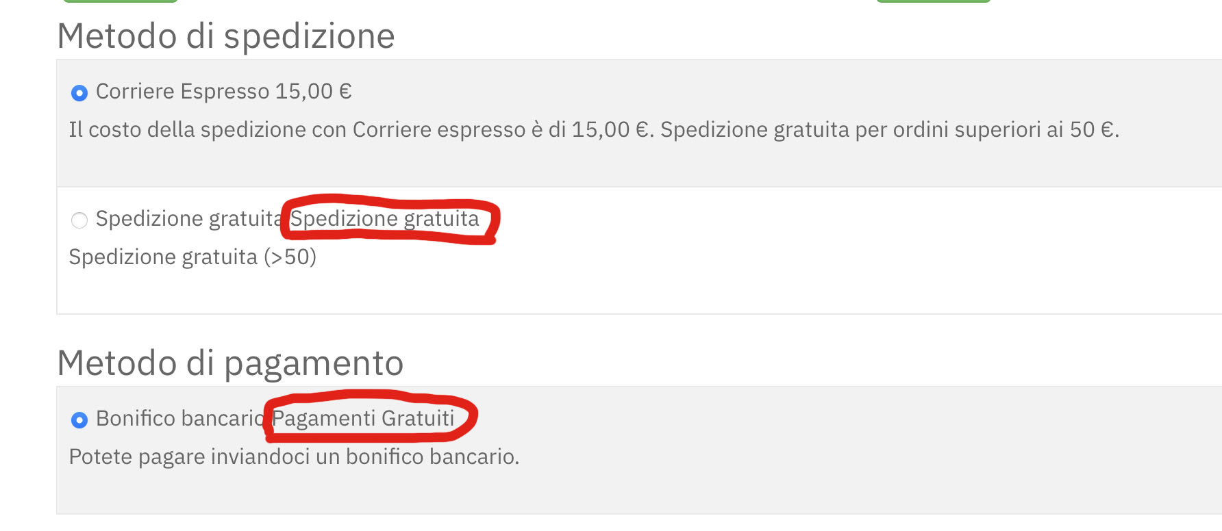 Also in the "Payment method", next to "Bank transfer" the words "Free payment" appear, which I would like to delete. Can you help me? Thank you very much.
