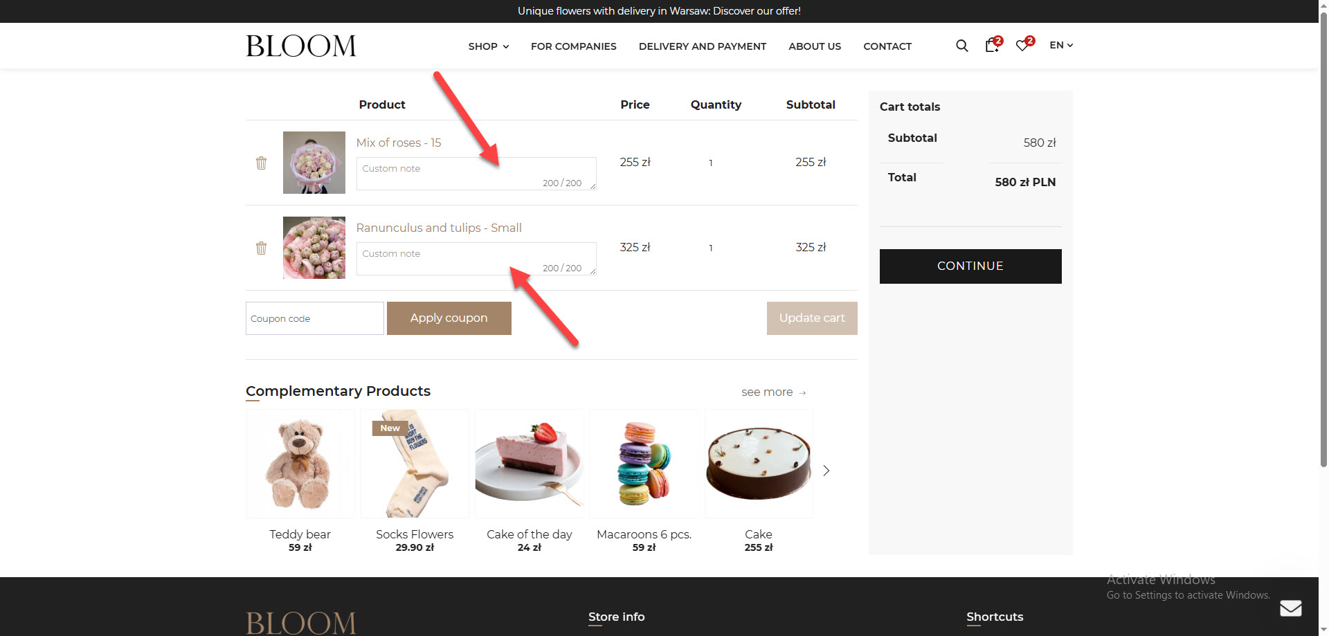 That way, you'll be able to enter a text in this custom field for each product, before adding them in the cart. And you can then modify the text for the products in the cart.