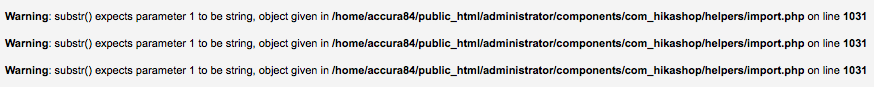-- Error-message(debug-mod must be tuned on) -- : Warning: substr() expects parameter 1 to be string, object given in /home/accura84/public_html/administrator/components/com_hikashop/helpers/import.php on line 1031