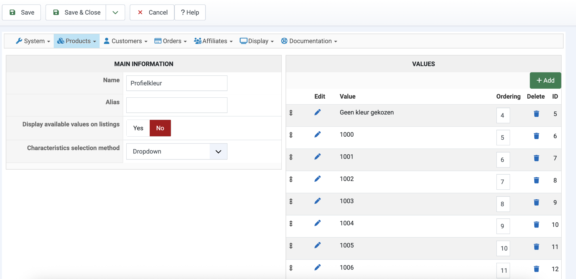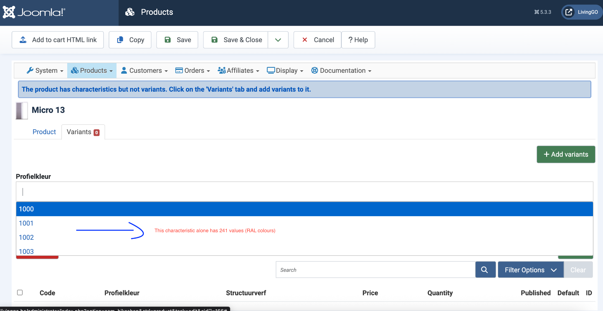 I'm building a webshop for window-decorations, so I need a lot of characteristics (about 240 RAL colours, structured paint or not, etc...) So Hikashop is good with the custom fields to enter the dimensions and I think I understand the Characteristics with their variants.... But in my case the price does not change, I just need that selected info in the order. To create 1 product now, I need 480 variants (each RAL colour x Structured paint or not) Is there not another, smarter way to just add 'options' to a product without all the variants (that need to be clicked 1 by 1 in the Characteristics list)