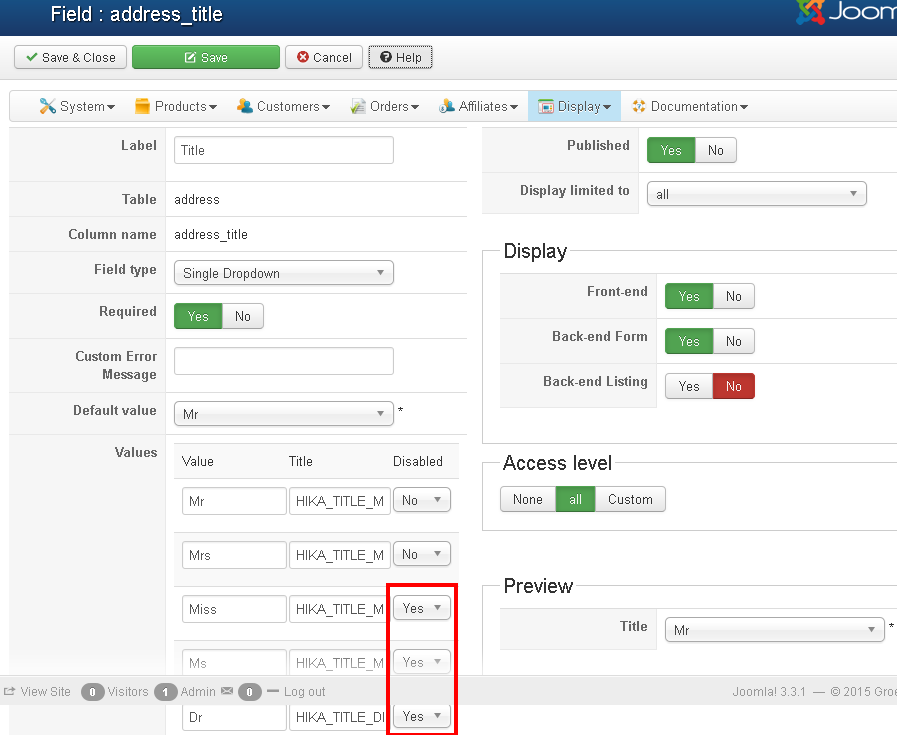 I disabled some options (Miss, Ms, Dr), but they still appear on the front end. A customer cannot choose them, but they still show.