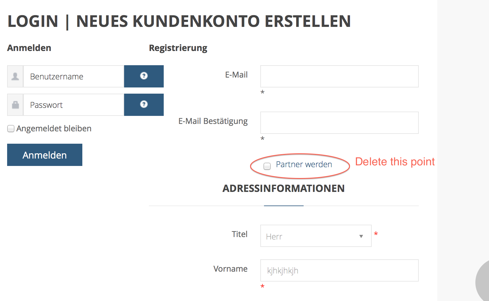 1. If I activate the “Redirect Joomla registration to Hikashop” plugin and set the ID of this menu item into the plugin, I get the following: After I fill in the registration form (by the way, why is there a field “become partner” just below the eMail fields?) and click “Register”, the page just re-loads, all fields become empty again and no new user is created.