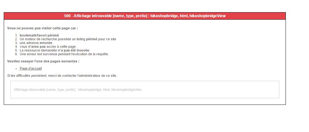 500 - Affichage introuvable [name, type, prefix] : hikashopbridge, html, hikashopbridgeView