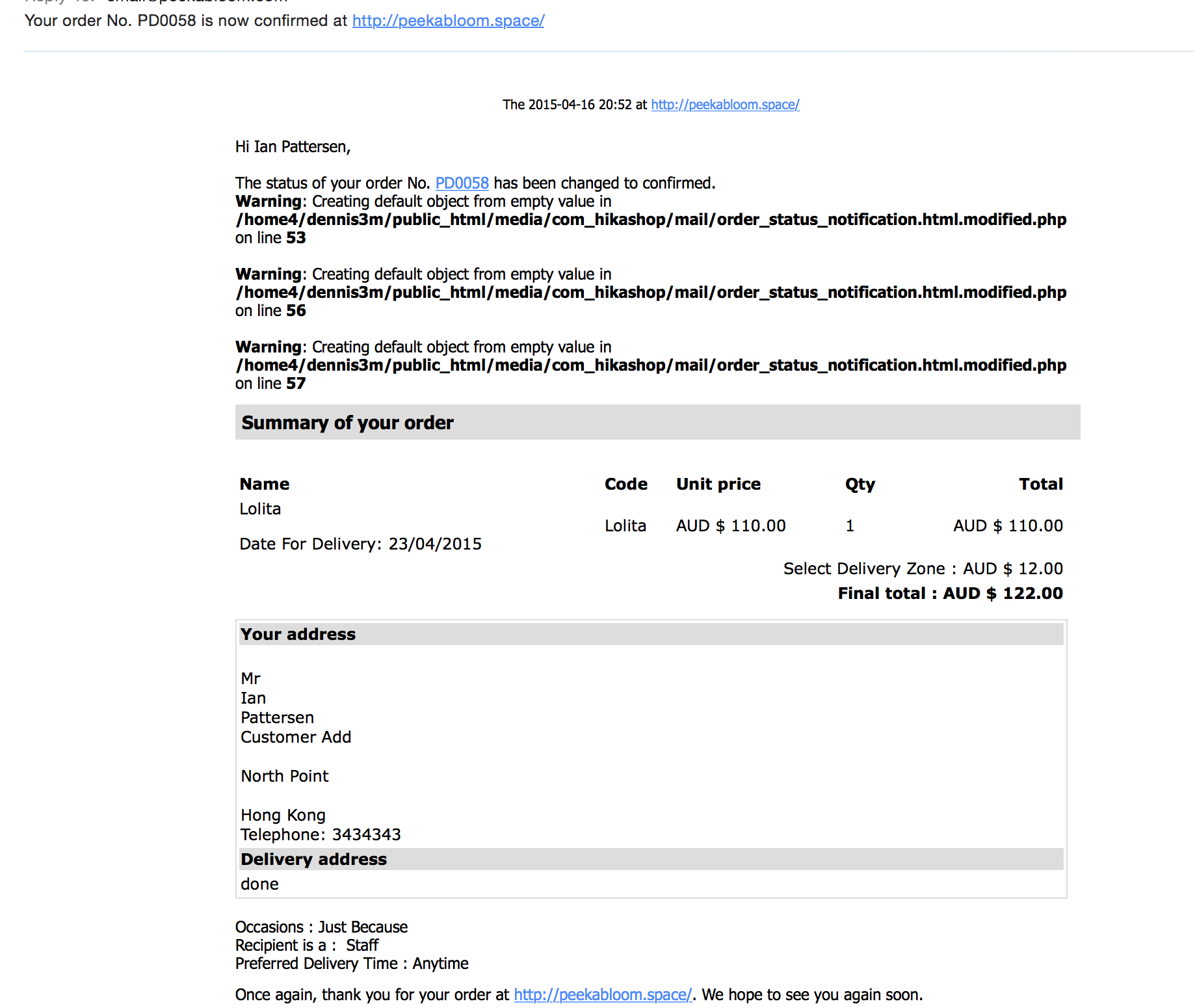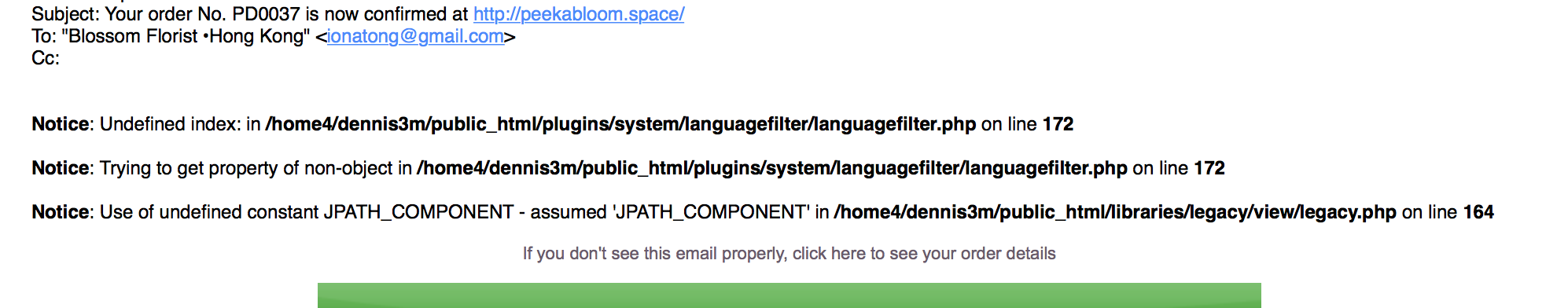And because there is no more PHP in the official HikaShop "order_status_notification.html" mail ; I think that you have inserted the PHP yourself.