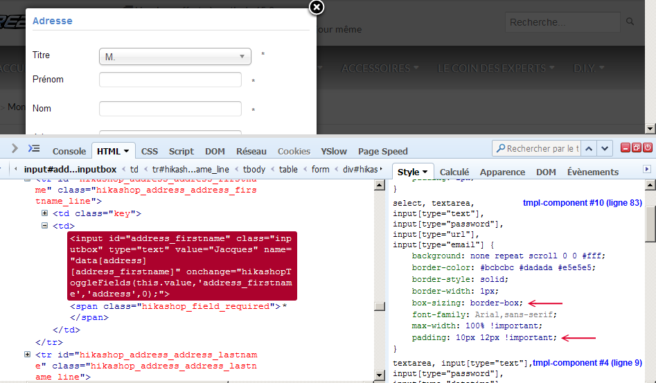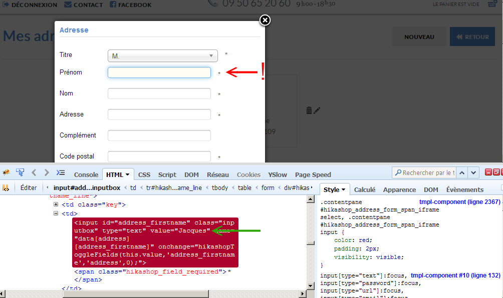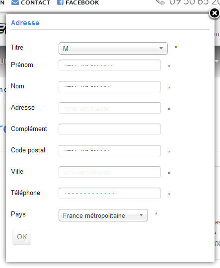 Il y a du nouveau : pour en avoir le cœur net, je me suis connecté avec ce même compte que vous avez créé (désolé, j'ai dû changer votre mot de passe). Toujours impossible de modifier l'adresse. MAIS : je me déconnecte (Firefox v 35), et me reconnecte, cette fois avec Chrome (v 43). Même tentative, et là, ô miracle (?), le contenu des champs textes apparaît tout à fait normalement — comme dans votres test — et j'arrive à éditer l'adresse.