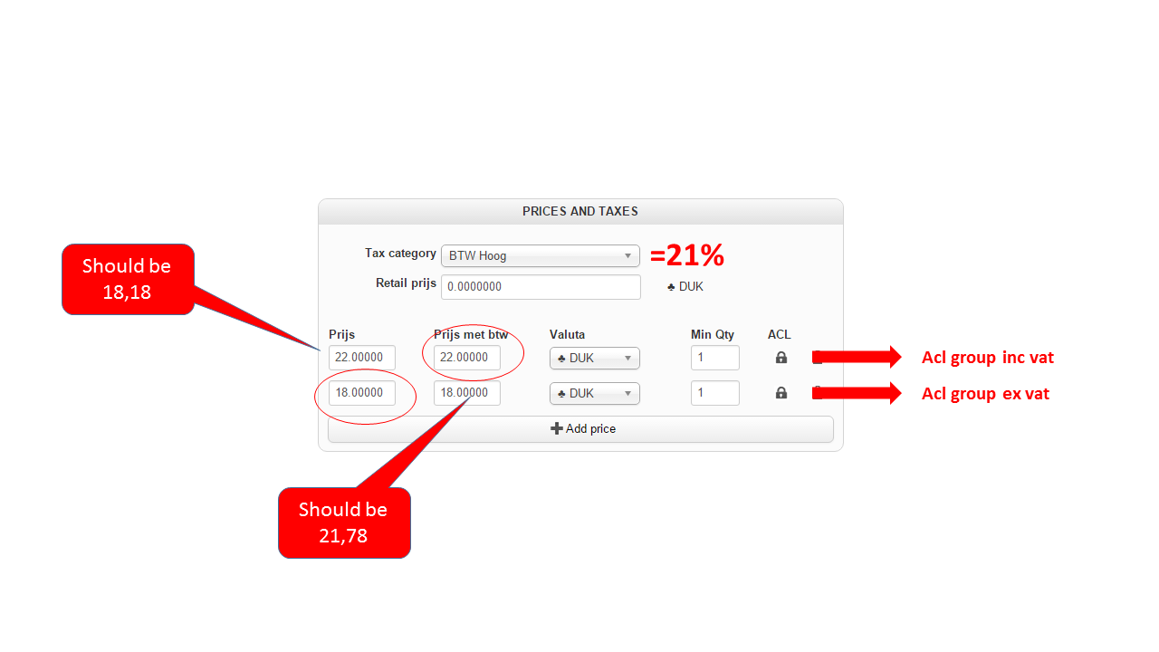 But, in the backend the price isn't calculated anymore: you can see that the price for inc-vat and ex-vat is the same. So, ex-vat is 22 and inc-vat is 22. This is not right: it should be 18,18 ex-vat and 22 inc-vat.