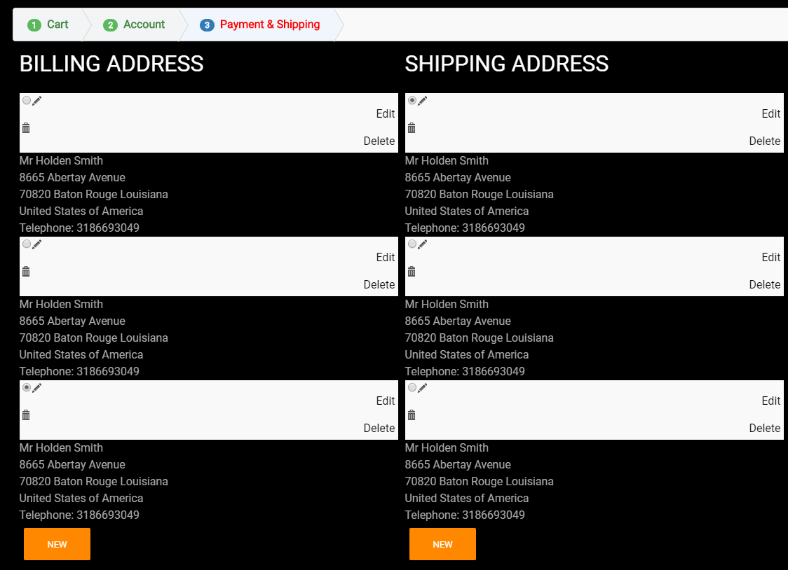 The test_hikashop address was added on the registration form, the test_hikashop2 was added with the new shipping address form after that with the "Address is also a billing address" checkbox unchecked. And for the test_hikashop3 it was added like the test_hikashop2 but with the checkbox checked.