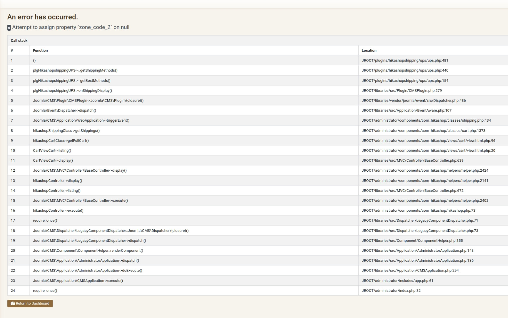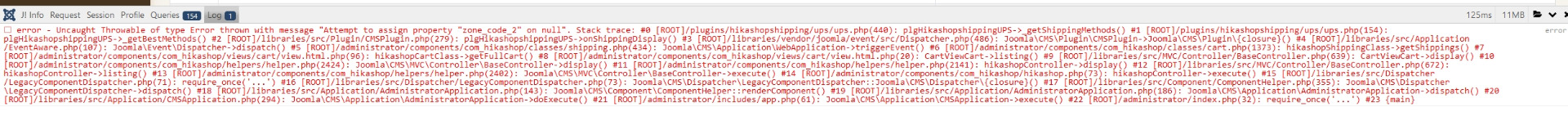 -- Error-message(debug-mod must be tuned on) -- : errorerror - Uncaught Throwable of type Error thrown with message "Attempt to assign property "zone_code_2" on null". Stack trace: #0 [ROOT]/plugins/hikashopshipping/ups/ups.php(440): plgHikashopshippingUPS->_getShippingMethods() #1 [ROOT]/plugins/hikashopshipping/ups/ups.php(154): plgHikashopshippingUPS->_getBestMethods() #2 [ROOT]/libraries/src/Plugin/CMSPlugin.php(279): plgHikashopshippingUPS->onShippingDisplay() #3 [ROOT]/libraries/vendor/joomla/event/src/Dispatcher.php(486): Joomla\CMS\Plugin\CMSPlugin->Joomla\CMS\Plugin\{closure}() #4 [ROOT]/libraries/src/Application/EventAware.php(107): Joomla\Event\Dispatcher->dispatch() #5 [ROOT]/administrator/components/com_hikashop/classes/shipping.php(434): Joomla\CMS\Application\WebApplication->triggerEvent() #6 [ROOT]/administrator/components/com_hikashop/classes/cart.php(1373): hikashopShippingClass->getShippings() #7 [ROOT]/administrator/components/com_hikashop/views/cart/view.html.php(96): hikashopCartClass->getFullCart() #8 [ROOT]/administrator/components/com_hikashop/views/cart/view.html.php(20): CartViewCart->listing() #9 [ROOT]/libraries/src/MVC/Controller/BaseController.php(639): CartViewCart->display() #10 [ROOT]/administrator/components/com_hikashop/helpers/helper.php(2424): Joomla\CMS\MVC\Controller\BaseController->display() #11 [ROOT]/administrator/components/com_hikashop/helpers/helper.php(2141): hikashopController->display() #12 [ROOT]/libraries/src/MVC/Controller/BaseController.php(672): hikashopController->listing() #13 [ROOT]/administrator/components/com_hikashop/helpers/helper.php(2402): Joomla\CMS\MVC\Controller\BaseController->execute() #14 [ROOT]/administrator/components/com_hikashop/hikashop.php(73): hikashopController->execute() #15 [ROOT]/libraries/src/Dispatcher/LegacyComponentDispatcher.php(71): require_once('...') #16 [ROOT]/libraries/src/Dispatcher/LegacyComponentDispatcher.php(73): Joomla\CMS\Dispatcher\LegacyComponentDispatcher::Joomla\CMS\Dispatcher\{closure}() #17 [ROOT]/libraries/src/Component/ComponentHelper.php(355): Joomla\CMS\Dispatcher\LegacyComponentDispatcher->dispatch() #18 [ROOT]/libraries/src/Application/AdministratorApplication.php(143): Joomla\CMS\Component\ComponentHelper::renderComponent() #19 [ROOT]/libraries/src/Application/AdministratorApplication.php(186): Joomla\CMS\Application\AdministratorApplication->dispatch() #20 [ROOT]/libraries/src/Application/CMSApplication.php(294): Joomla\CMS\Application\AdministratorApplication->doExecute() #21 [ROOT]/administrator/includes/app.php(61): Joomla\CMS\Application\CMSApplication->execute() #22 [ROOT]/administrator/index.php(32): require_once('...') #23 {main}