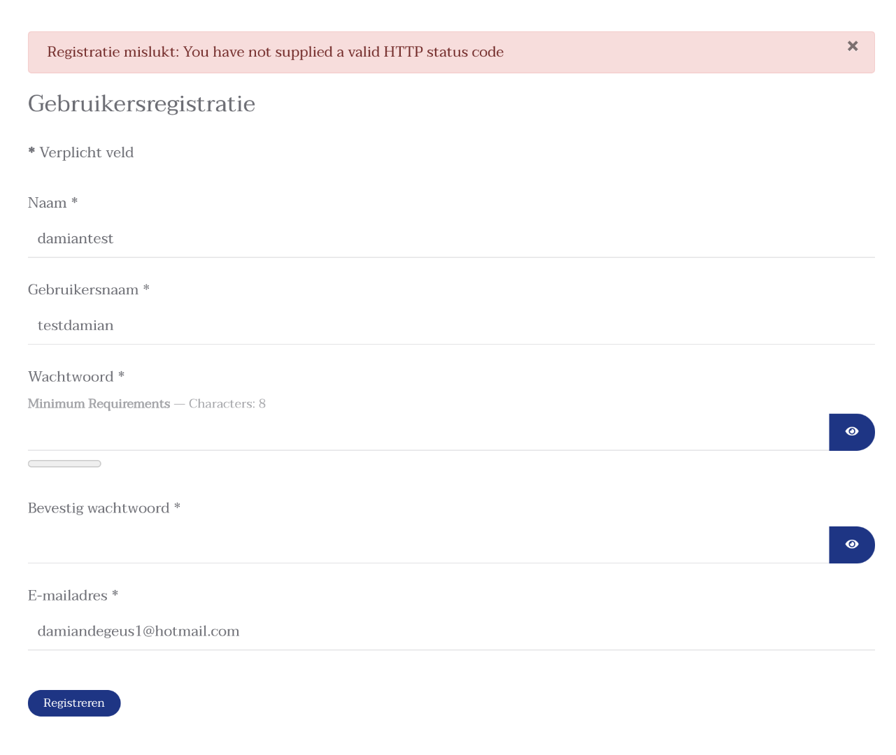 -- Error-message(debug-mod must be tuned on) -- : Registration failed: You have not supplied a valid HTTP status code