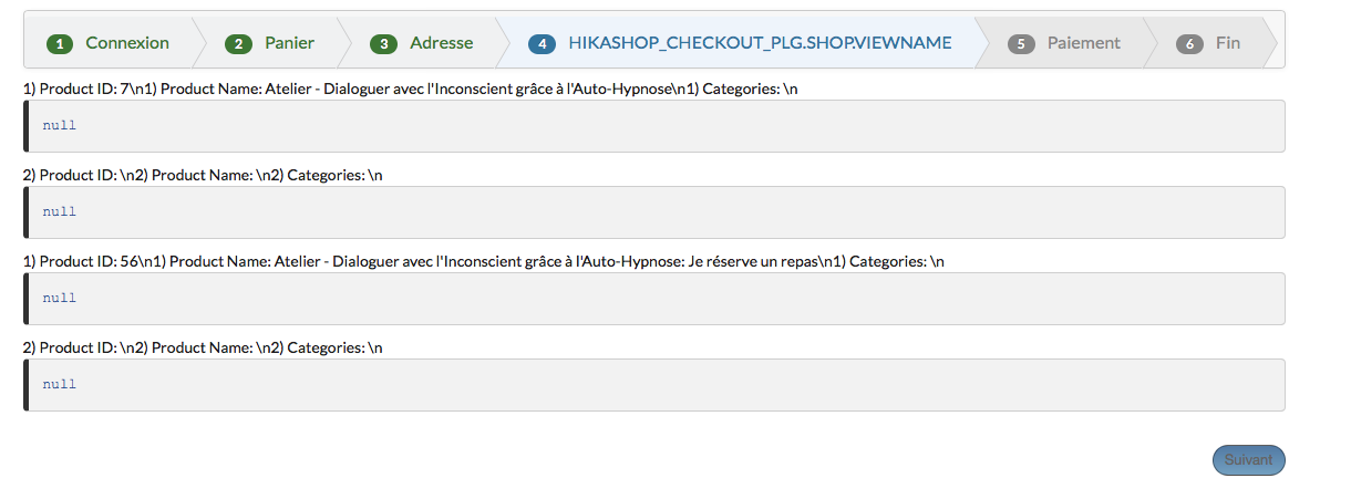 Dans la partie site, la méthode onCheckoutStepDisplay fonctionne correctement (voir le listage de quelques propriétés produit dans jpg) mais pour le nom dans l'onglet de l'étape, je sèche... A quel moment, fait-on la connexion entre la vue (php) et la liste ?