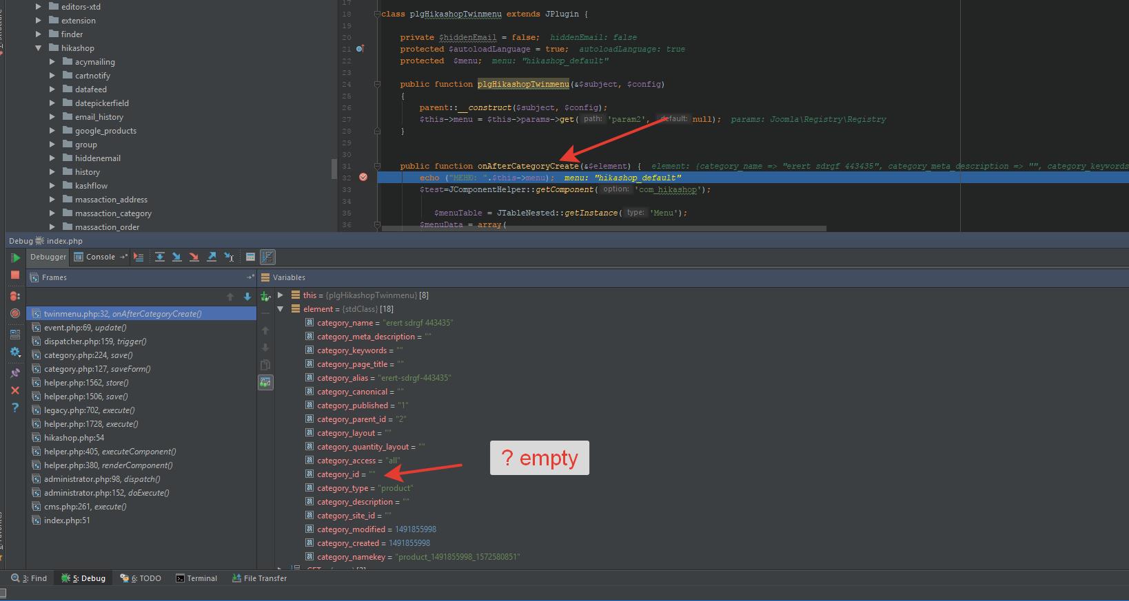 Please modify the HikaShop category class in order to place the trigger call after the category_id is set in the object