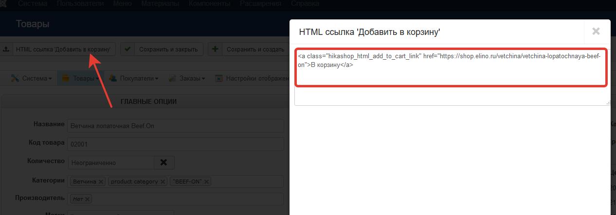 echo '<textarea style="width:100%" rows="5"><a class="hikashop_html_add_to_cart_link" href="'. hikashop_completeLink('product&task=updatecart&qty=1&cid='.$product_id.$id, false, false, false, true).'">'.JText::_('ADD_TO_CART').'</a></textarea>';in the file administrator/components/com_hikashop/controllers/product.php and it will then provide a correct link in the HTML of the popup.