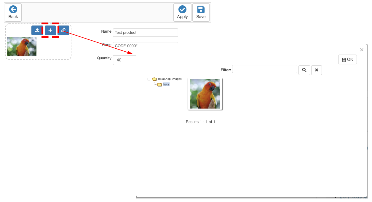 The input field is connected to a custom field of Hikashop (text type) and we need to save the selected server path into this field.