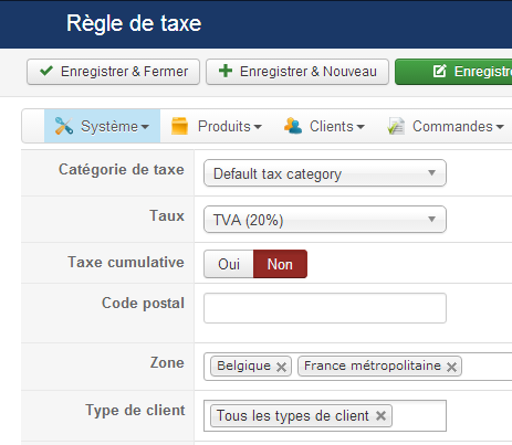 Copie d'écran de la définition de la TVA (= Système > Taxes : 'Default tax category') :
