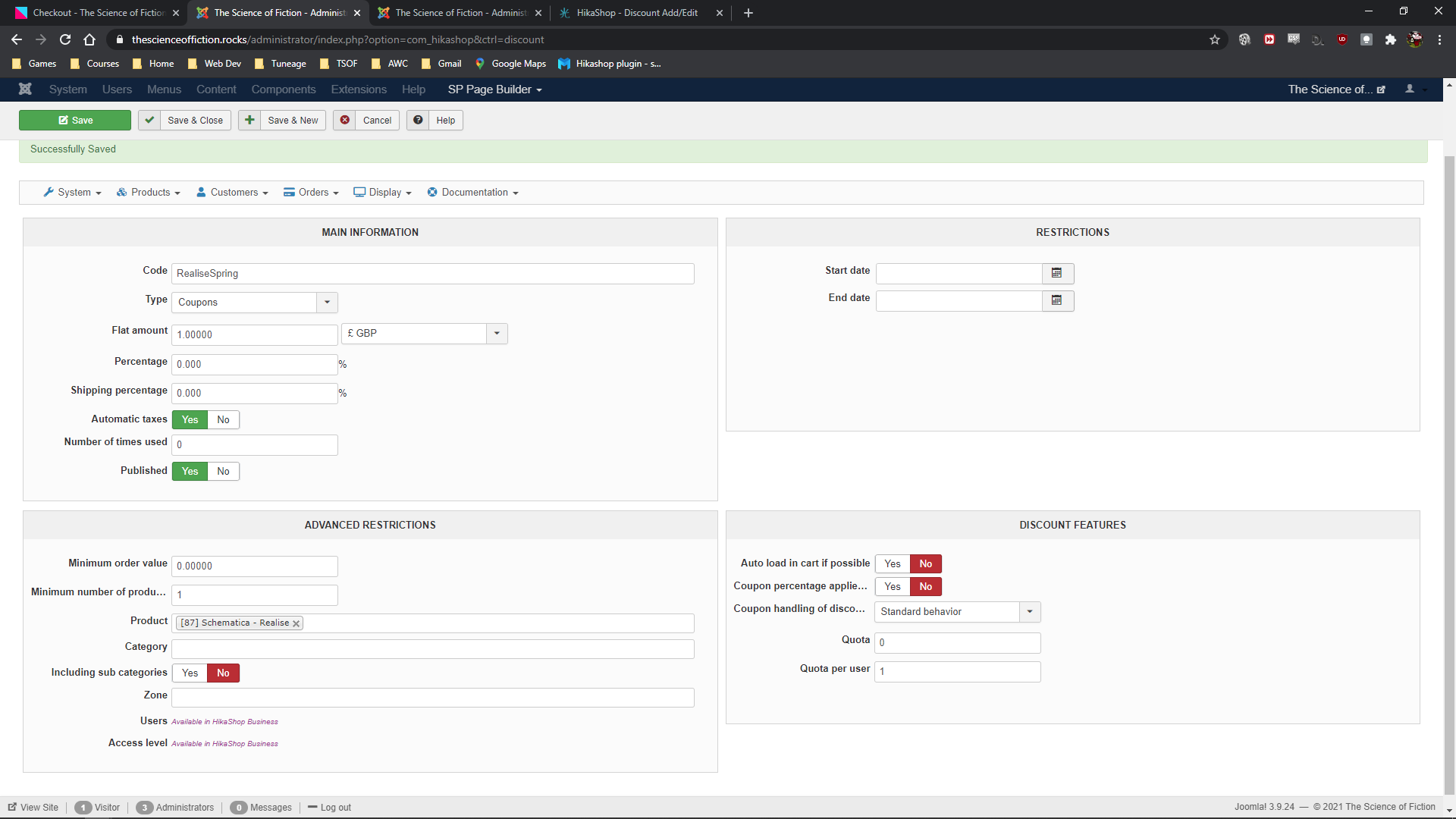 I have created a coupon for a specific product (see settings image) and added that product to my cart. When I enter the coupon code I get an error saying the coupon isn't valid (see checkout image).