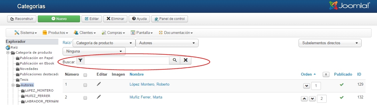 Instead of doing a search plugin, I add a custom field to my product table in order to do a filter based in this custom field. Then, I developed a product plugin based on "onBeforeProductCreate" and "onBeforeProductUpdate" triggers, in wich I look for authors categories, and concatenate its "category_name" fields saving this value in my custom field as you can see in next code: