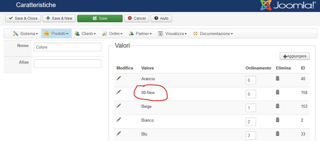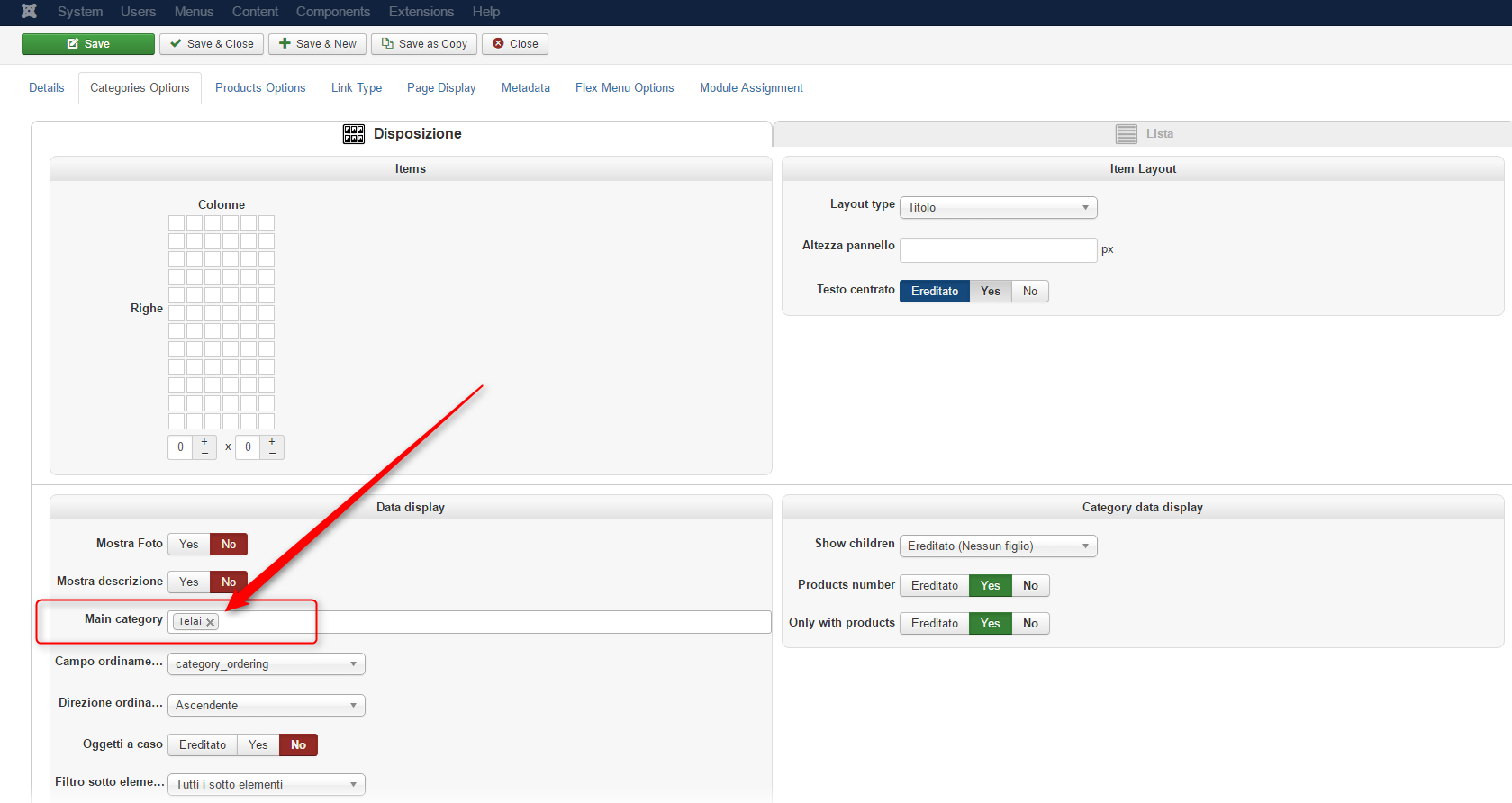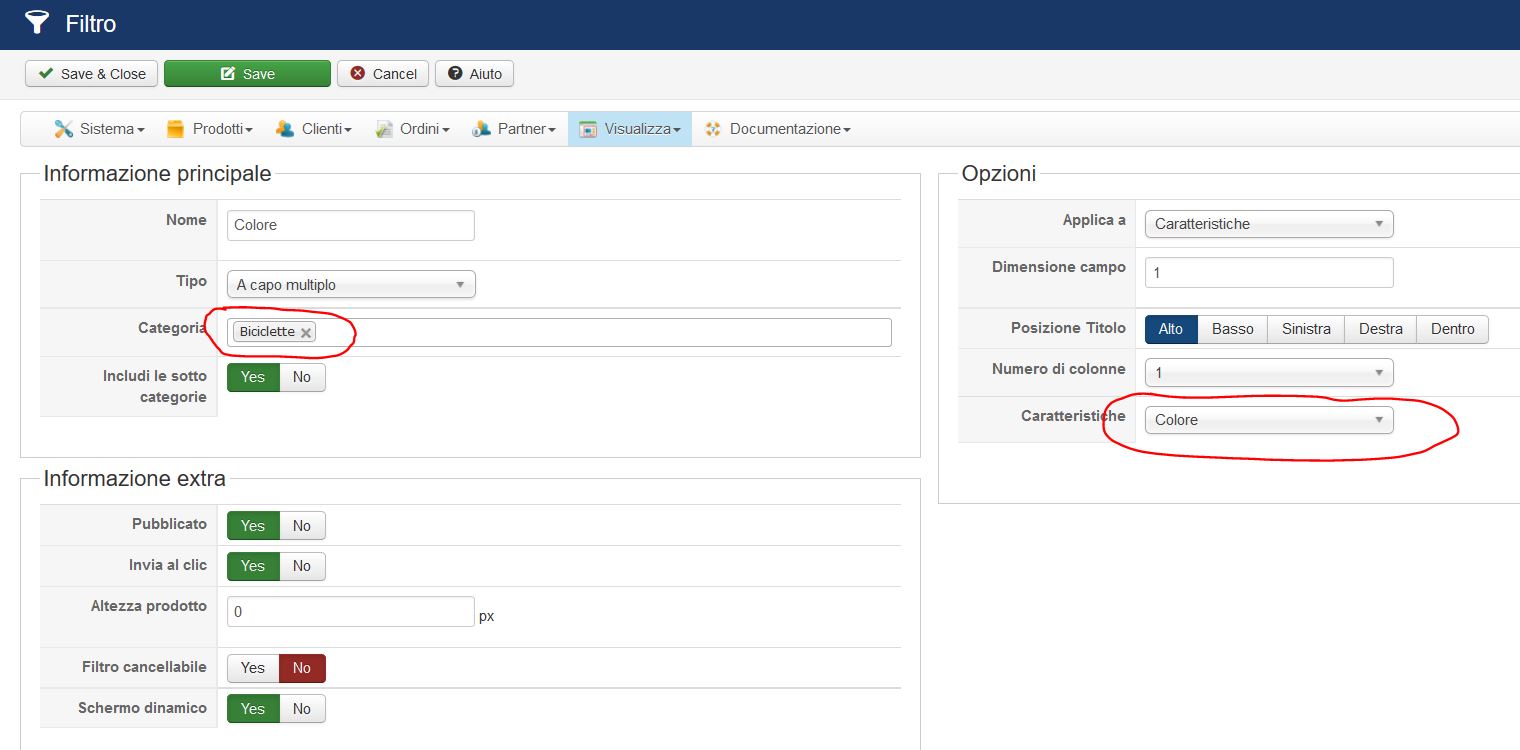 - IMAGE 3: the filter configuration. I create a filter called COLORE (=color in english); I set the category BICICLETTE, the same of the menu; the characteristic associated is COLORE (parameter on the right of the image), I included the subcategory;