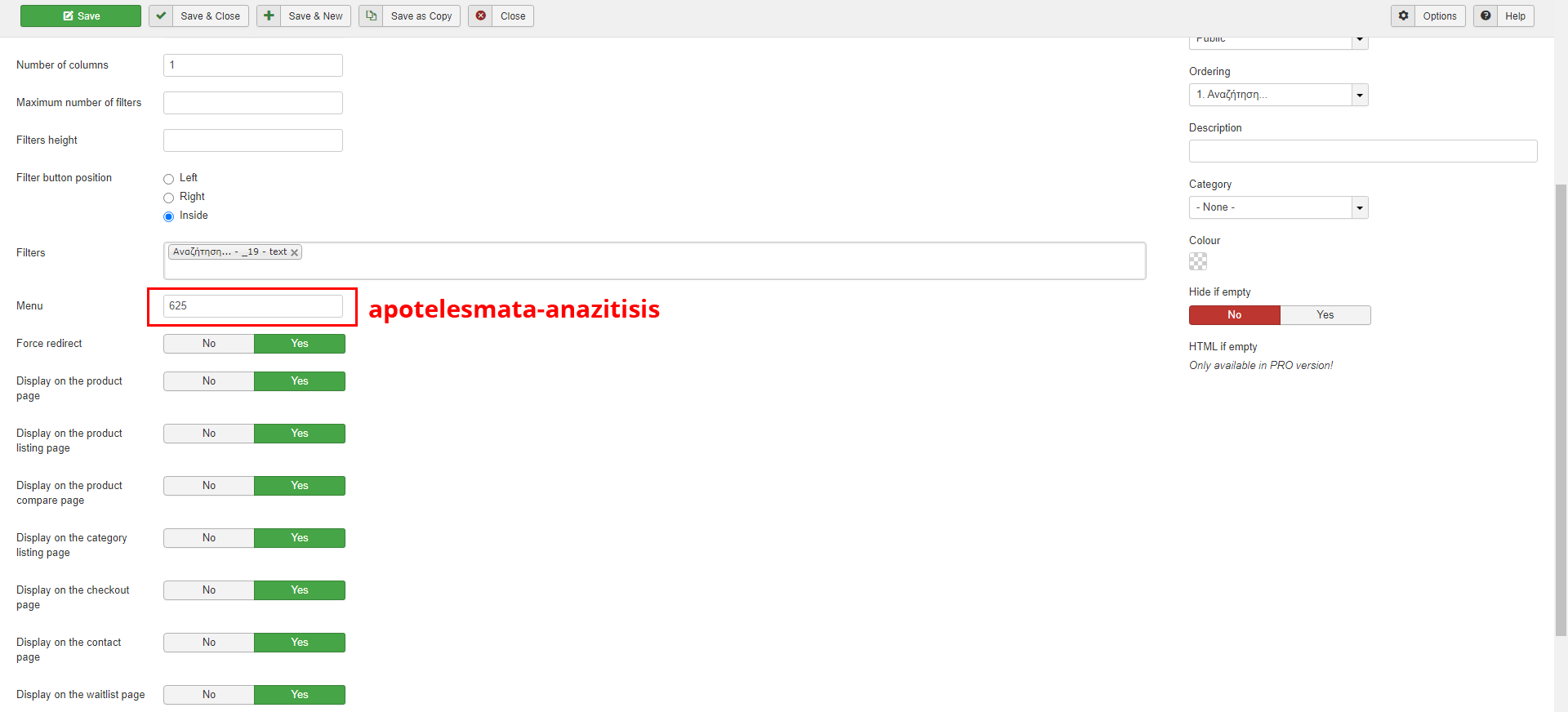 Then, in your filters module that you have on the left sidebar, you must have configured the "menu assignment" setting to not display the left sidebar filter module on that "apotelesmata-anazitisis" menu item.