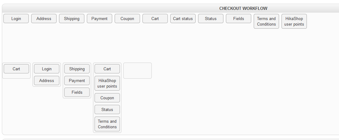 5. My checkout workflow is set up like this: Cart-> login, address-> shipping, payment, fields->cart,userpoints,status,terms->end