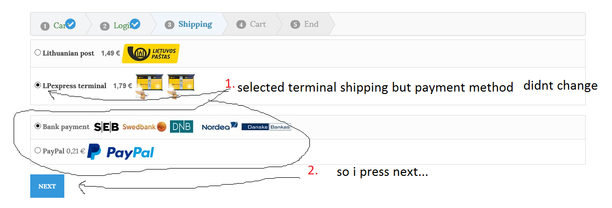2. As I said in my previous message I have some issues with payment method restriction to shipping zones. As example I have restricted one payment method to show only if 1 shipping method selected. When I select that shipping method, shipping div refreshes but payment methods does nothing. If I try to select one of payment method which shouldn't be seen it does nothing. Its like selecting checkbox....